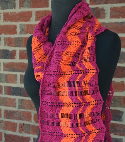 This scarf is designed to be a summer scarf, light and airy. Using a yarn with linen will add to the summer feel. Since this scarf is cast on for the long edge, all of the drop stitches end up appearing horizontally across the scarf. At the same time the color change striping appears to run vertically through the scarf. The combination of vertical and horizontal details draws the eye and makes this scarf a great addition to any wardrobe.